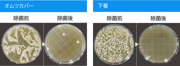 アルカリ性電解水でたんぱく質汚れを落とし、酸性電解水で除菌と消臭を行います。