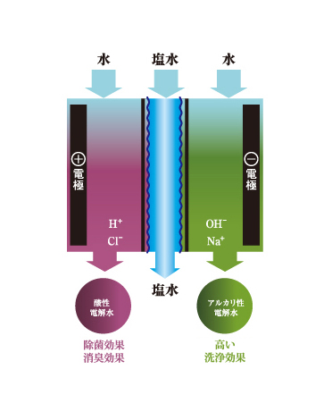 目には見えなくても、私たちが暮らす日常空間には様々な細菌が潜んでいます。 その対策として有効な手段が、塩と水を電気分解して生成する「電解水」。 洗浄力の「アルカリ性電解水」と除菌力の「酸性電解水」が、施設の衛生管理をサポートします。 しかも、生成には薬品類をいっさい使用しないため、安心してご使用いただけます。 食品業界や福祉施設をはじめ幅広いシーンで、清潔な環境作りをお手伝いいたします。